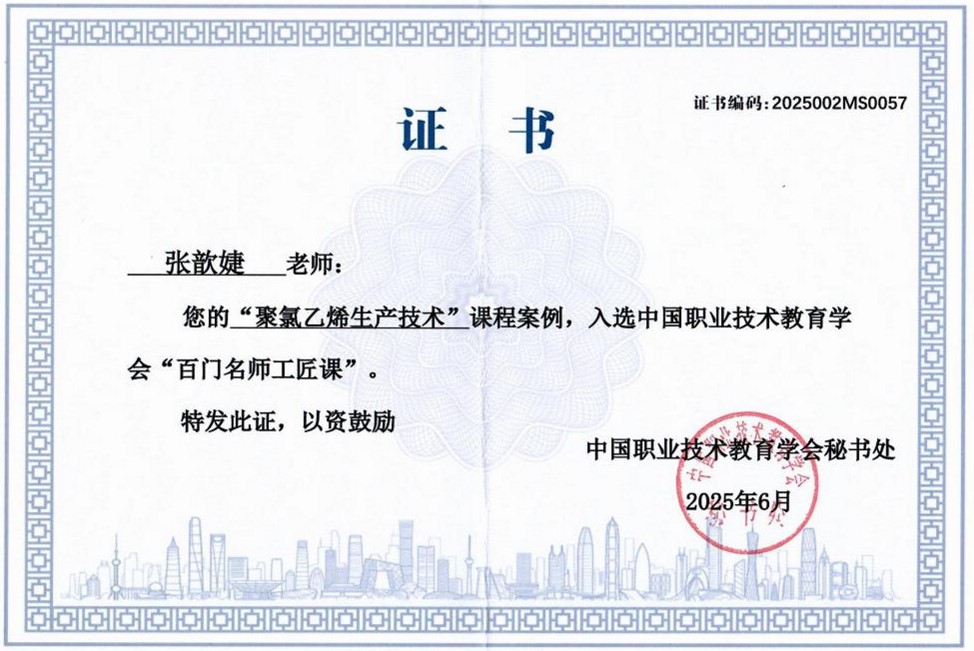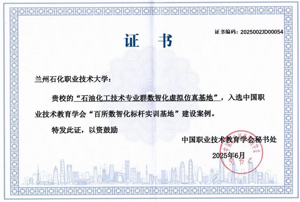 “双百”项目遴选由教育部职成司委托中国职业技术教育学会组织开展。此次入选的“石油化工技术专业群数智化虚拟仿真基地”,围绕石油化工产业链的数智化发展需求,以国家“双高计划”石油化工技术专业群建设为核心,依托虚拟现实和人工智能等前沿技术,构建了覆盖石油炼制、石油化工、高分子合成、材料加工等全流程的沉浸式实训体系。基地突破传统实训高危、高成本、高能耗的瓶颈,实现复杂工艺的可视化操作与故障模拟,年服务校内师生、兄弟院校及国际教学超19000人次,为培养适应石油化工行业“数转智改”需求的高端技能人才提供了核心支撑。省级课程思政示范课程《聚氯乙烯生产技术》,聚焦技术技能人才培养与生产实践脱节的突出问题,深度融合产业新技术与工匠精神培育,以模块化项目教学为核心,联合企业开发动态教学资源,实现技能培养与数字素养、思政教育的巧妙结合。